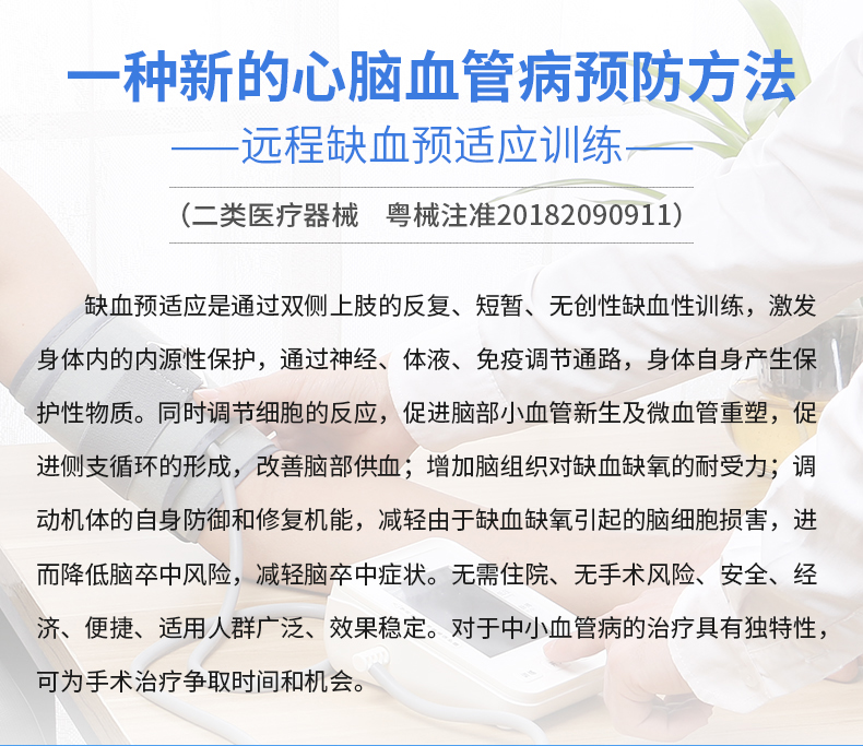 7、是心脑血管领域的科技爆炸性产品,全新的理念(预适应),不吃药不打针,通过锻炼血管来实现效果,简便易学,市场前景大;