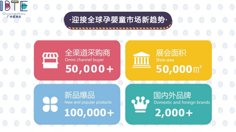 IBTE广州国际孕婴童产品博览会,是华南地区具有一定规模、影响力的孕婴童全品类一站式采购盛会。首届广州国际孕婴童产品博览于2021年4月6日-8日在中国进出口商品交易会展馆成功举办!立足华南,面向华南六省三地及东南亚的国内外孕婴童市场,展会占地50000平米超过2000+参展企业。展品包括玩具、孕婴童用品、童车、汽座及家具、幼教产品、孕婴童食品、保健品及零食、孕婴童鞋服及配饰、孕婴童机械及配件、IP授权、IP衍生品及服务等几十个分类。