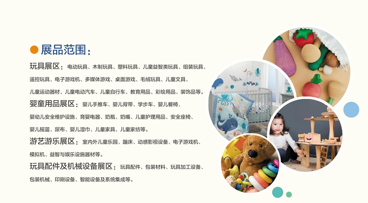 玩具、幼教及纪念品:潮流玩具、文创、手办模型、IP 授权展品、周边衍生品、木质玩具、纸类玩具、电子电动玩具、塑胶玩具、积木玩具、拼插图玩具、玩偶及布毛绒玩具;智能教育个人终端产品、基础教育设备、在线及远程教育、幼教产品、教材教育、文具、纪念品童装、童鞋、儿童配饰及婴童家纺:婴童服装、婴童鞋袜、婴童包袋、婴童配饰、孕产妇服装及配件、婴童家纺