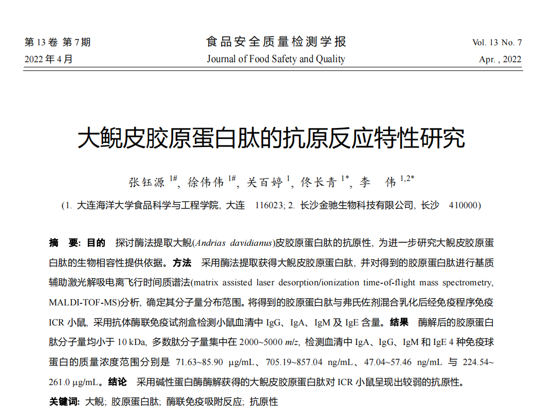 相关研究成果以“大鲵皮胶原蛋白肽的抗原反应特性研究”为题,发表在《食品安全质量检测学报》上。该工作第一作者是李伟教授团队的硕士研究生张钰源和徐伟伟。